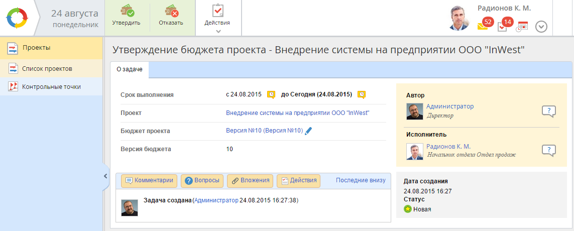 Рис. 7. Страница задачи утверждения бюджета проекта