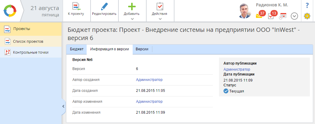 Рис. 1. Страница бюджета проекта. Вкладка "Информация о версии"