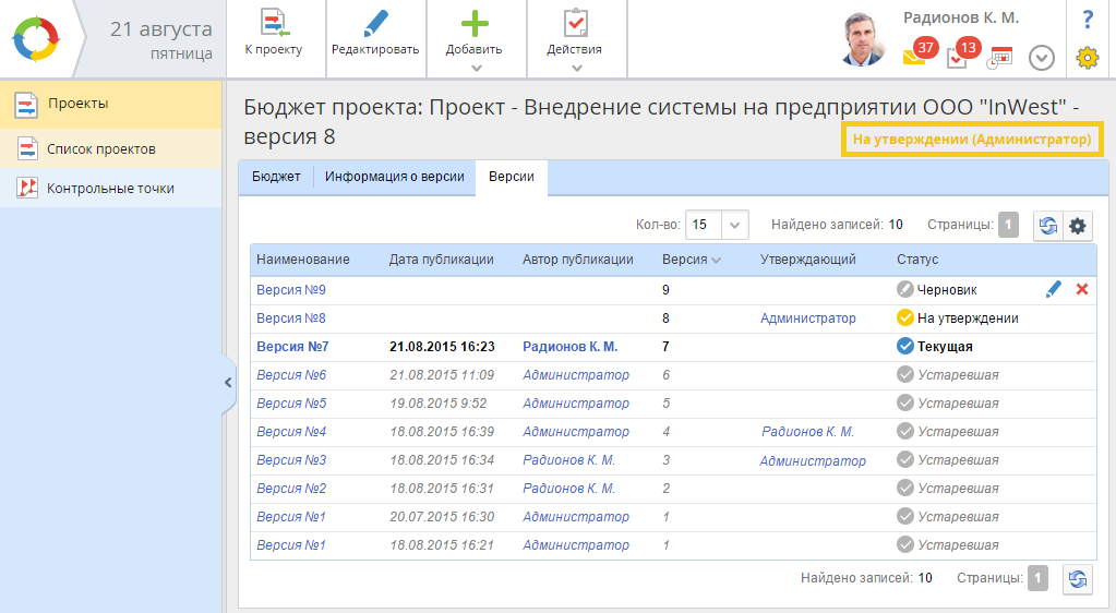 Статусы версий бюджета проекта аналогичны статусам версий плана проекта. Подробнее см. соответствующий раздел справки.