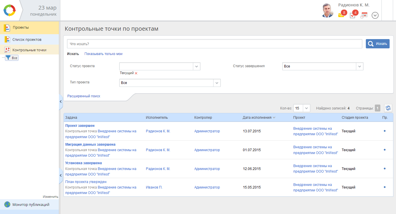 Рис. 1. Раздел "Проекты". Подраздел "Контрольные точки"