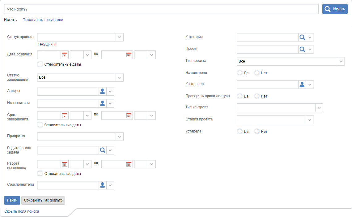 Статус проекта – возможность выбора из выпадающего списка статуса проекта: Текущий, Черновик, Завершен.