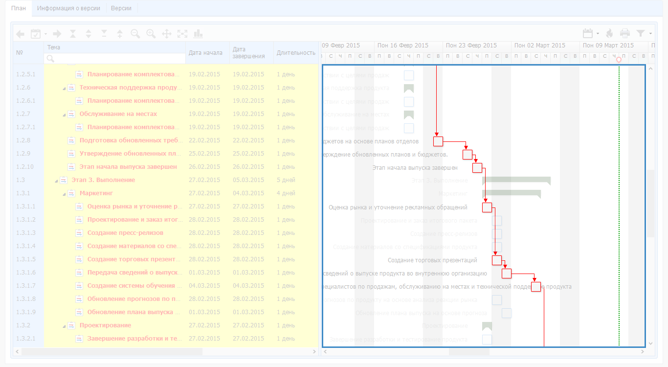 Приложение ELMA Проекты+ позволяет легко построить критический путь, для этого необходимо нажать на пиктограмму , расположенную на панели инструментов плана проекта. После этого на диаграмме Ганта красным цветом будет обозначен критический путь, т.е. последовательность задач, непосредственно влияющих на сроки завершения проекта (рис. 1).