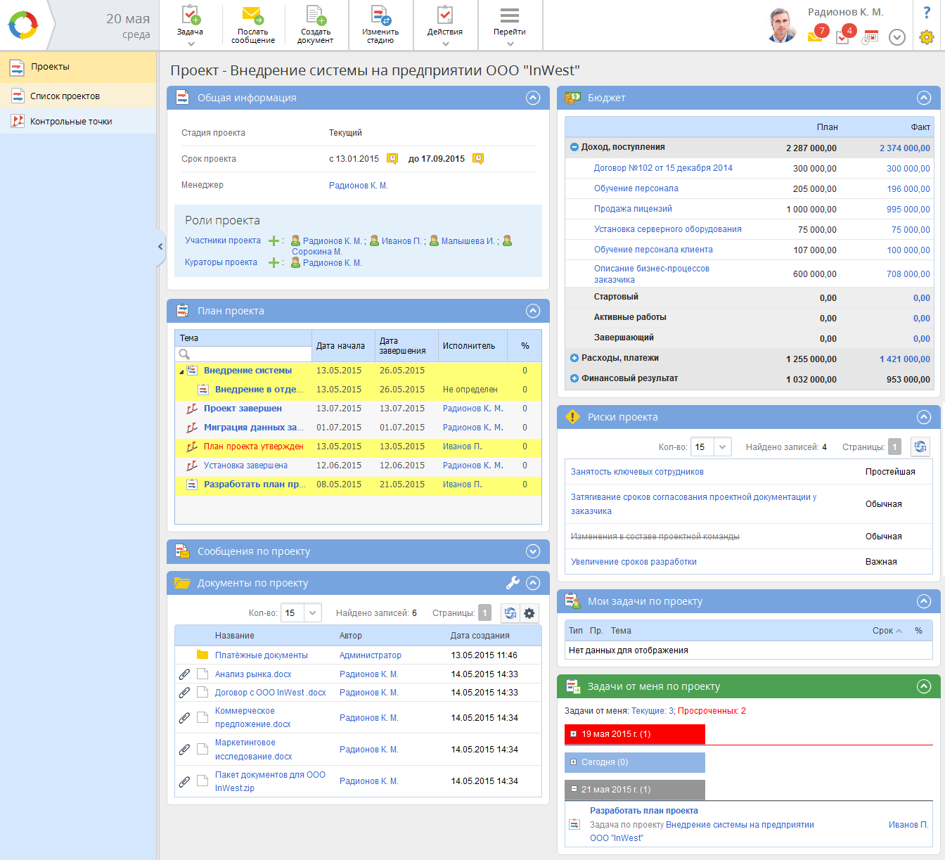 Максимальный набор портлетов на странице проекта (после создания проекта) отображается у администратора, менеджера и куратора проекта и состоит из следующих портлетов: "Общая информация", "План проекта", "Сообщения по проекту", "Документы по проекту", "Бюджет", "Риски проекта", "Мои задачи по проекту", "Задачи от меня по проекту".