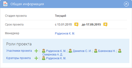 По умолчанию в данном портлете (рис. 2) отображается общая информация по проекту: стадия, даты начала и завершения проекта, менеджер, а также роли. При необходимости для даты начала/окончания проекта могут быть добавлены напоминания. Следует отметить, что уведомления могут быть добавлены только для предстоящих событий.
