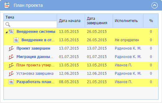 По умолчанию в данном портлете (рис. 3) отображаются все задачи, запланированные в плане проекта. При нажатии на название портлета осуществляется автоматический переход на страницу соответствующего компонента проекта.