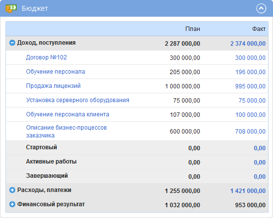 По умолчанию в данном портлете (рис. 4) отображается весь бюджет проекта по этапам. При нажатии на название портлета осуществляется автоматический переход на страницу соответствующего компонента проекта.