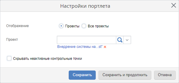 Персональные настройки данного портлета частично аналогичны персональным настройкам портлета Текущие проекты. Различие заключается только в наличии дополнительной настройки Скрывать неактивные контрольные точки, которая позволяет скрыть в портлете все контрольные точки, следующие за текущей. Подробнее см. соответсвующий раздел справки.