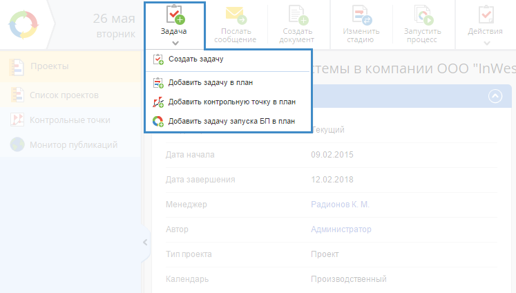 Рис. 2. Страница проекта. Кнопка "Задача – Добавить задачу в план, Добавить контрольную точку в план, Добавить задачу запуска БП в план"