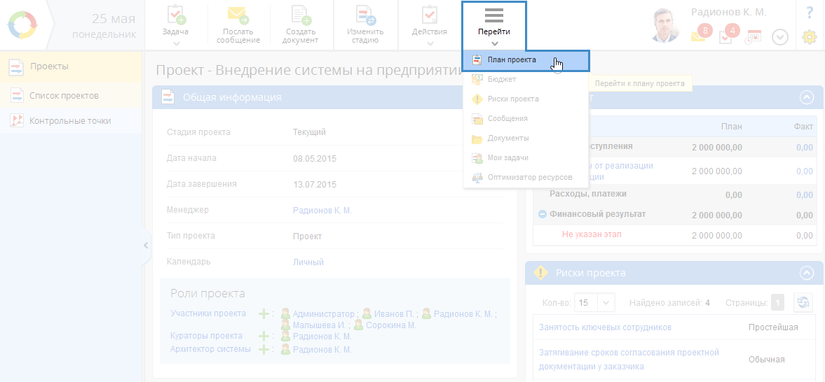на странице требуемого проекта нажать на кнопку Перейти – План проекта, расположенную в верхнем меню (рис. 1);