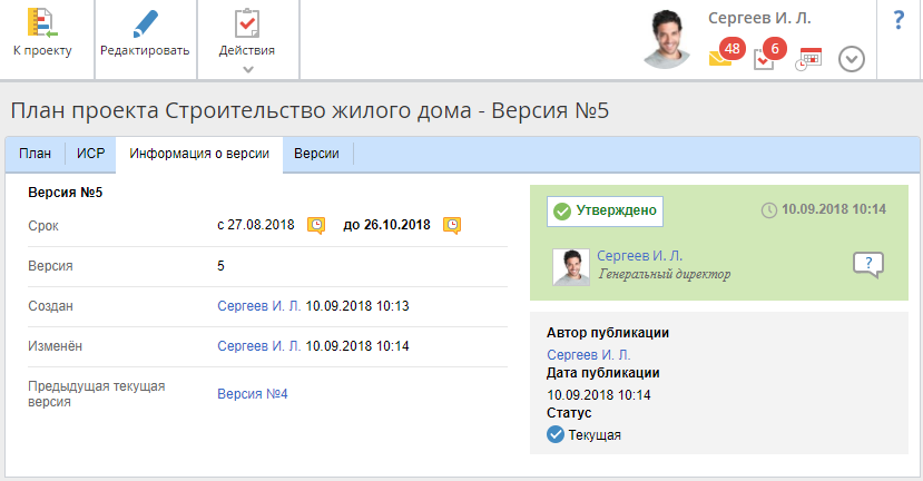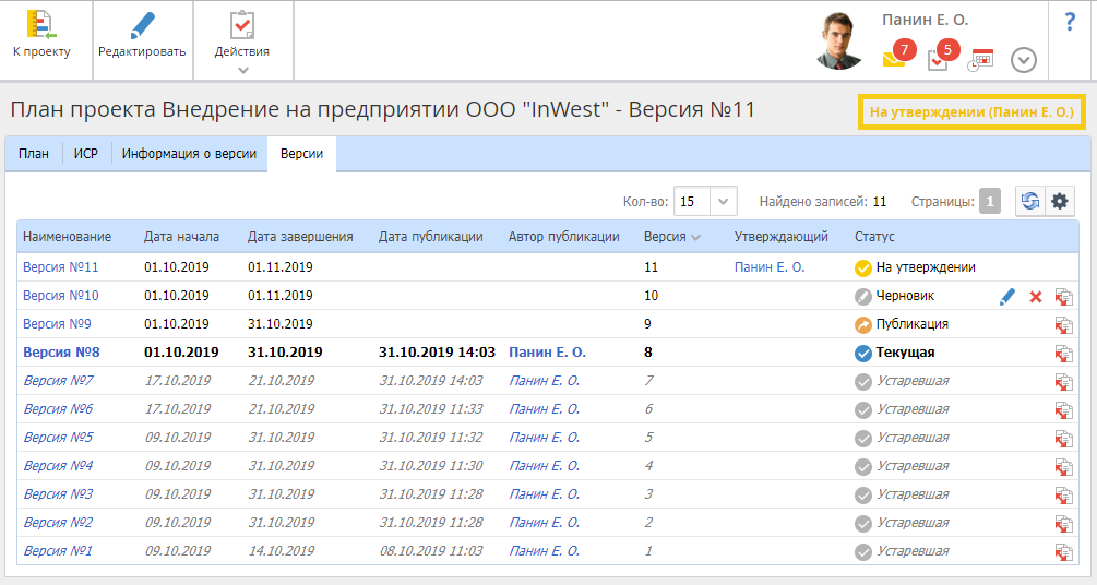 Текущая – актуальная, действующая на текущий момент времени версия плана проекта, которая была опубликована и задачи по которой поставлены исполнителям. В плане проекта может быть только одна версия со статусом "Текущая";