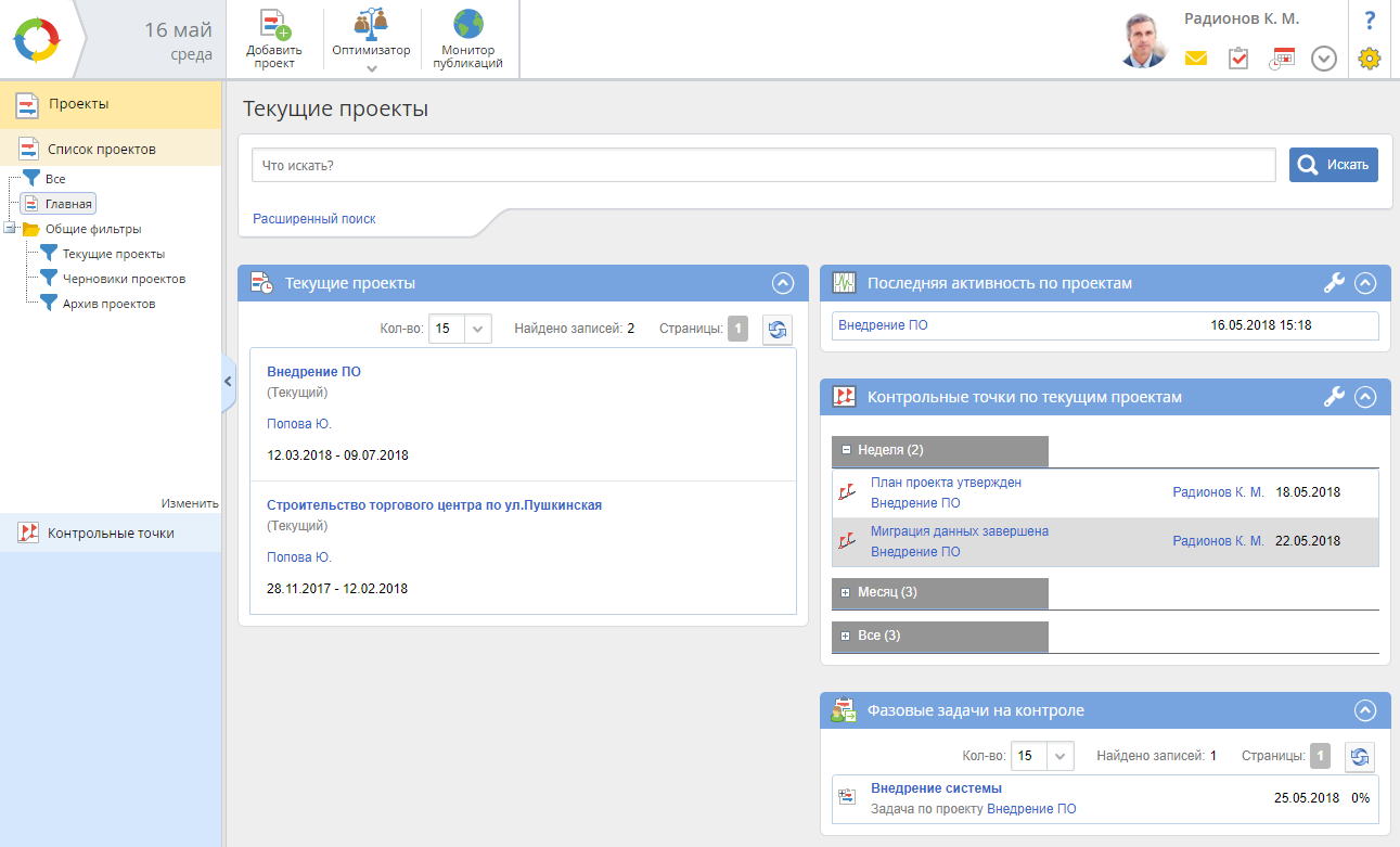Рис. 1. Раздел "Проекты". Стартовая (портлетная) страница