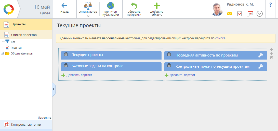 Рис. 2. Раздел "Проекты". Страница персональных настроек