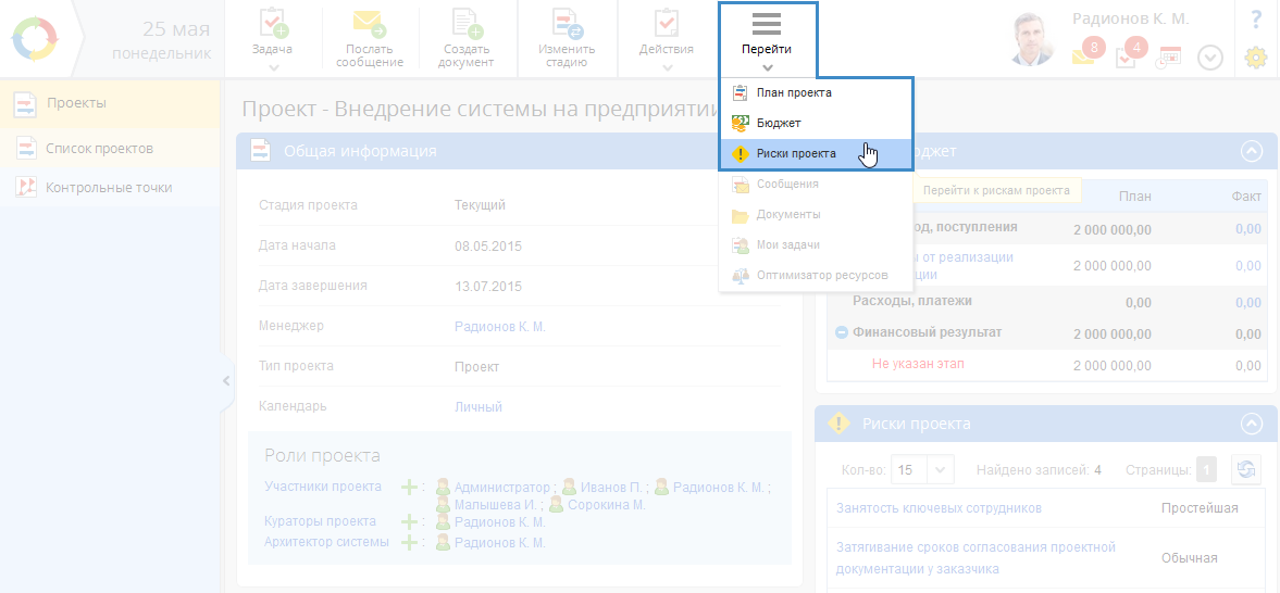 Рис. 1. Страница проекта. Кнопка "Перейти – Риски проекта"
