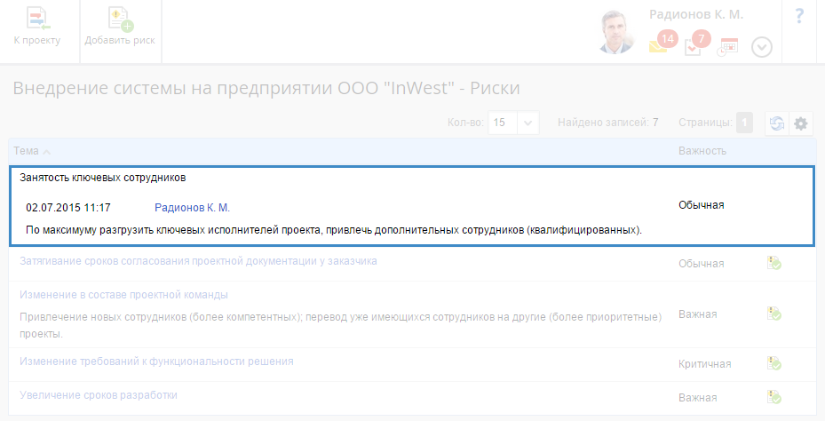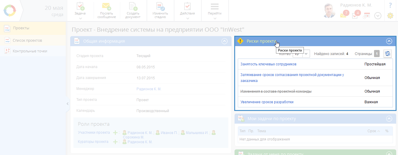 Рис. 3. Раздел "Проекты". Компонент "Риски проекта"