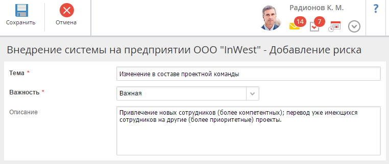 Тема * – название создаваемого риска. Данное поле является обязательным для заполнения.
