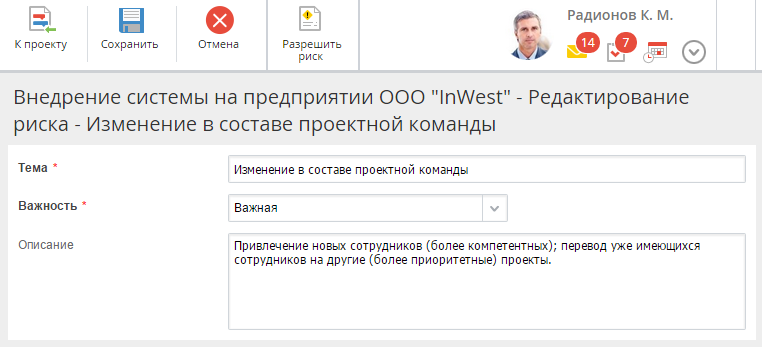 Для редактирования риска необходимо на странице рисков проекта (рис. 3) нажать название требуемого риска. Открывшаяся страница (рис. 5) аналогична странице добавления риска. Отличие заключается только в наличии дополнительных кнопок верхнего меню.