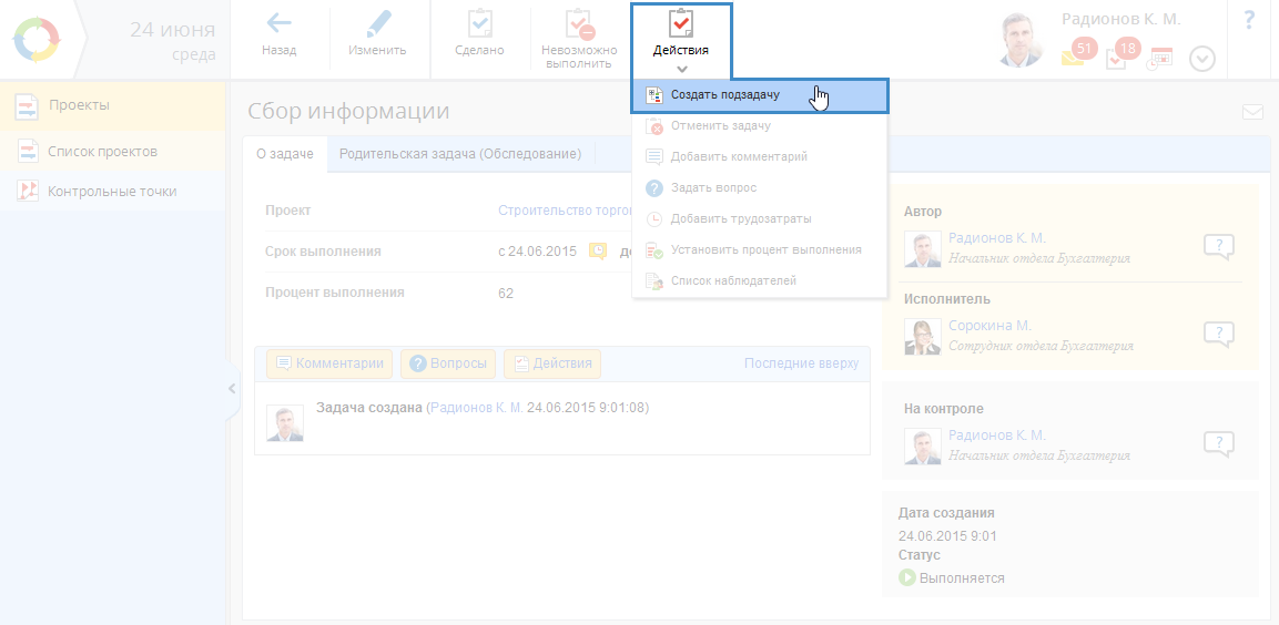 Рис. 1. Страница задачи по проекту. Кнопка "Действия – Создать подзадачу"