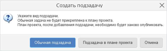 В открывшемся диалоговом окне (рис. 2) необходимо нажать на кнопку Обычная подзадача. При нажатии на кнопку Подзадача в плане проекта будет осуществлен автоматический переход на страницу редактирования плана проекта с формой создания подзадачи по проекту. Данная форма аналогична форме создания задачи по проекту. Созданная подзадача будет добавлена в план проекта. Подробнее о создании задач в плане проекта см. соответствующий раздел справки. При нажатии на кнопку Отмена будет осуществлено закрытие данного диалогового окна.