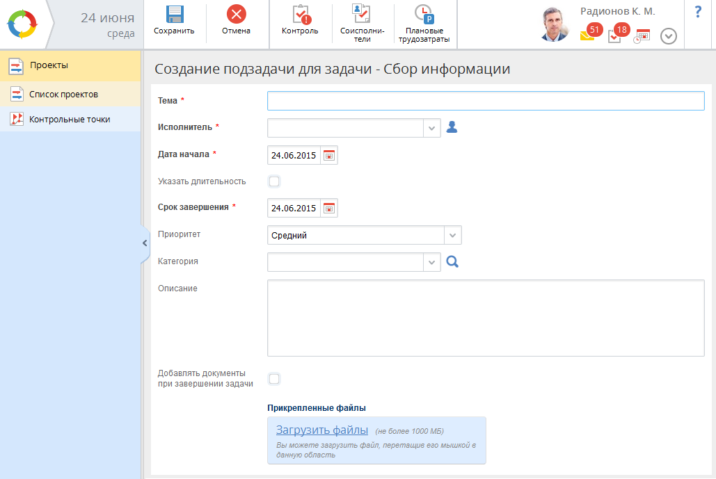 Рис. 3. Страница создания подзадачи вне плана проекта