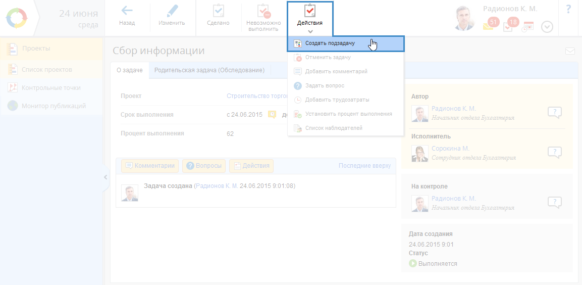 Рис. 1. Страница задачи по проекту. Кнопка "Действия – Создать подзадачу"