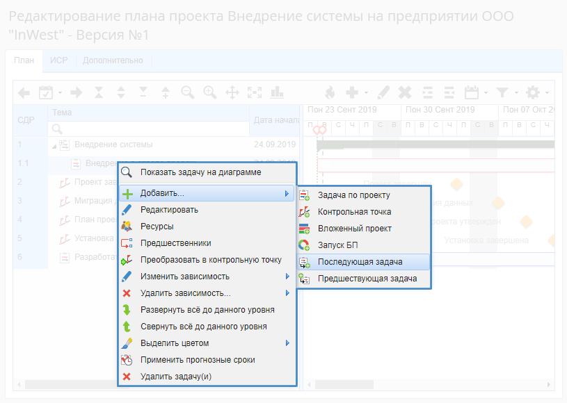 на странице редактирования плана проекта в контекстном меню требуемой задачи нажать на одну из кнопок Добавить… – Подзадачу, Последующую задачу, Предшествующую задачу (рис. 2);