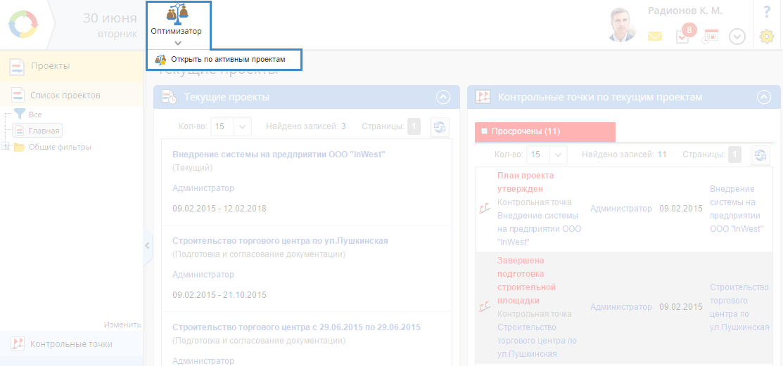 Рис. 1. Раздел "Проекты". Кнопка "Оптимизатор – Открыть по активным проектам"