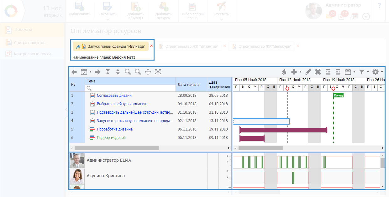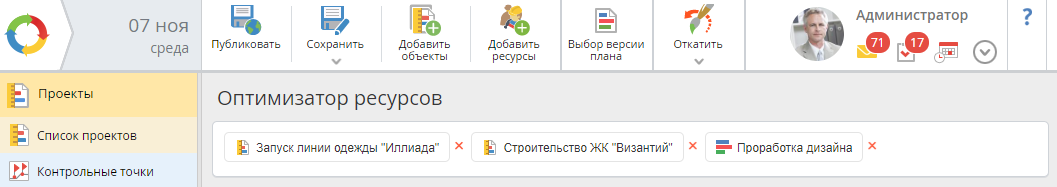 Страница оптимизатора ресурсов с выбранными проектами выглядит следующим образом (рис. 5):