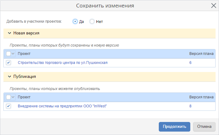 Рис. 7. Диалоговое окно при публикации планов проектов