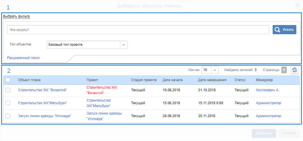 После осуществления поиска диалоговое окно будет развернуто. Развернутое диалоговое окно состоит из формы поиска объектов (рис. 9, цифра 1) и таблицы с результатами поиска (рис. 9, цифра 2).