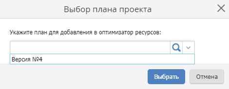 В выпадающем списке отображаются версии плана проекта со статусом "Текущая" и "Черновик". Для завершения добавления версии плана проекта на страницу оптимизатора ресурсов необходимо нажать на кнопку Выбрать.