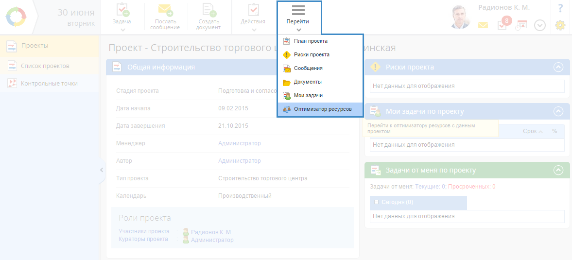 Рис. 3. Страница проекта. Кнопка "Перейти – Оптимизатор ресурсов"