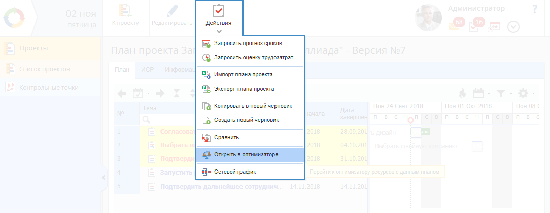Базовом типе проекта отображается статус проекта, план которого будет открыт в оптимизаторе ресурсов;