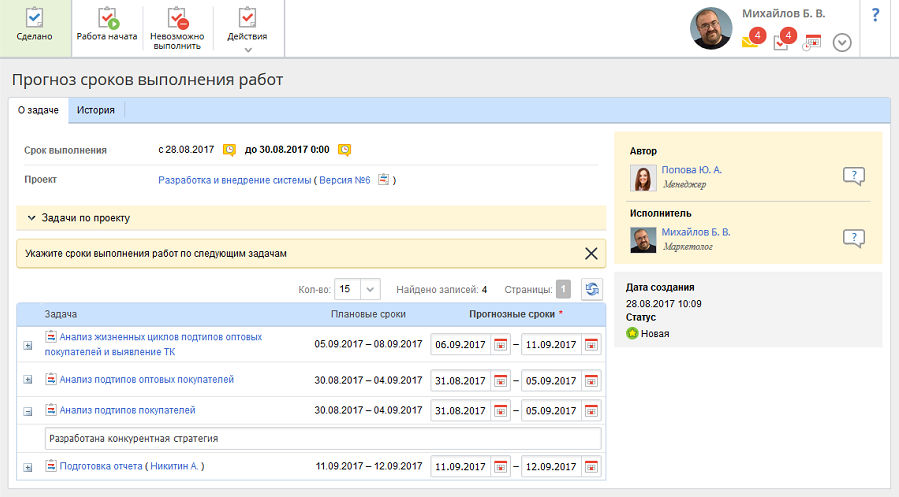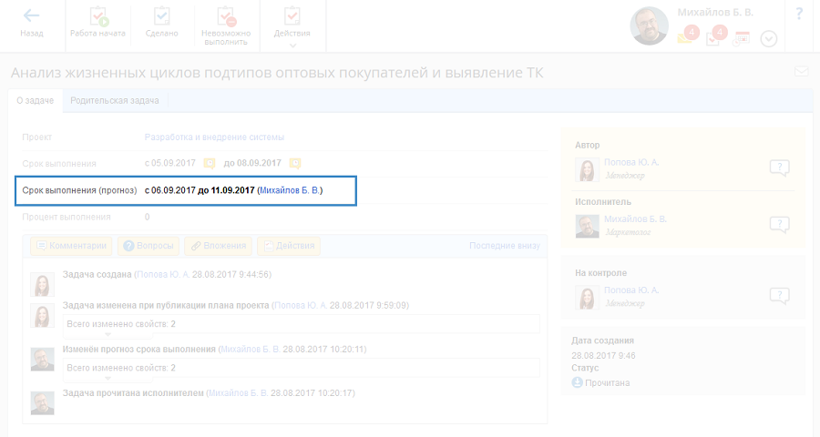 Внесенные прогнозные сроки выполнения задач будут добавлены в план проекта и отображены на странице соответствующих задач (рис. 4).