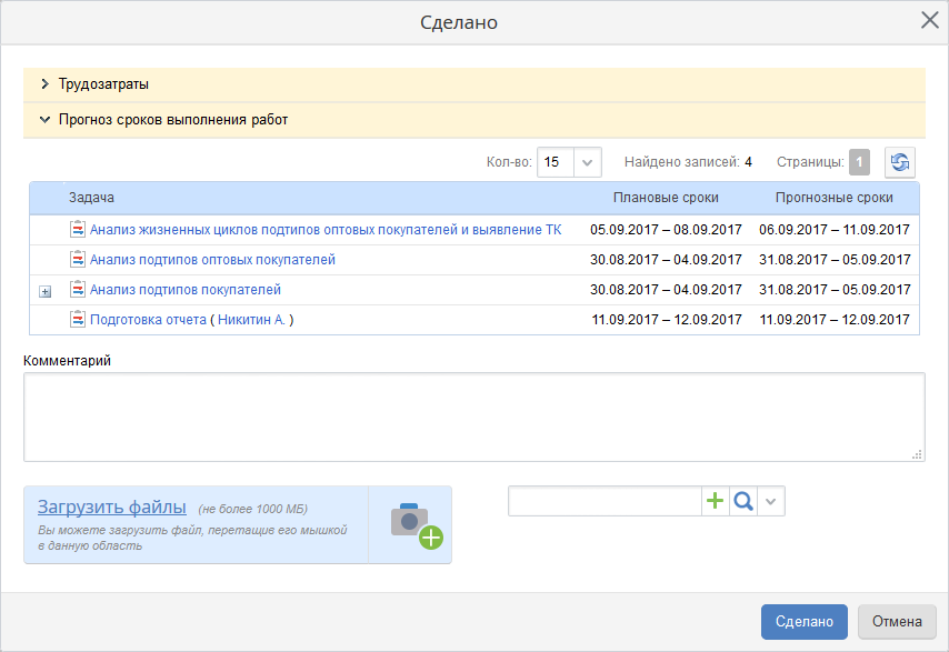 После заполнения прогнозных сроков для всех задач из списка необходимо нажать на кнопку верхнего меню Сделано. После этого отобразится диалоговое окно (рис. 3) с панелями Трудозатраты и Прогноз сроков выполнения работ. При необходимости можно добавить комментарий и/или приложить файл. Для завершения работ необходимо нажать на кнопку Сделано. Подробнее о завершении работы над задачами см. в соответствующем разделе справки.