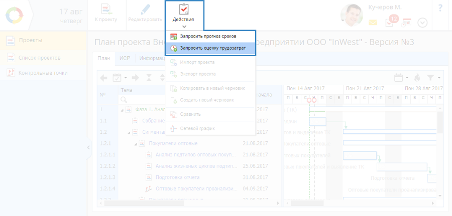 Следует отметить, что активность кнопки Действия – Запросить оценку трудозатрат зависит от установленной настройки Учёт трудовых ресурсов в разделе Администрирование – Проекты+ – Типы проектов. При выбранных значениях Вычисление сроков задач и Двойная зависимость в верхнем меню страницы плана проекта данная кнопка отсутствует, а плановые трудозатраты рассчитываются автоматически.