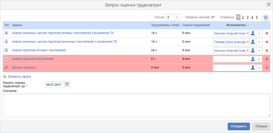 Исполнитель * – пользователь, являющийся ответственным за выполнение задачи. В случае, если в задаче не указан исполнитель, данная задача будет подсвечена красным цветом (рис. 2). При изменении исполнителя в задаче прогнозирования сроков выполнения работ будет указан исполнитель задачи из плана проекта. При нажатии на кнопку Отправить без указания исполнителя отобразится диалоговое окно с соответствующим предупреждением (рис. 3).