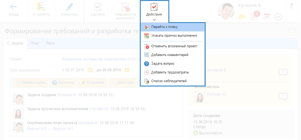 Рис. 1. Страница вложенного проекта. Кнопка "Действия – Перейти к плану"