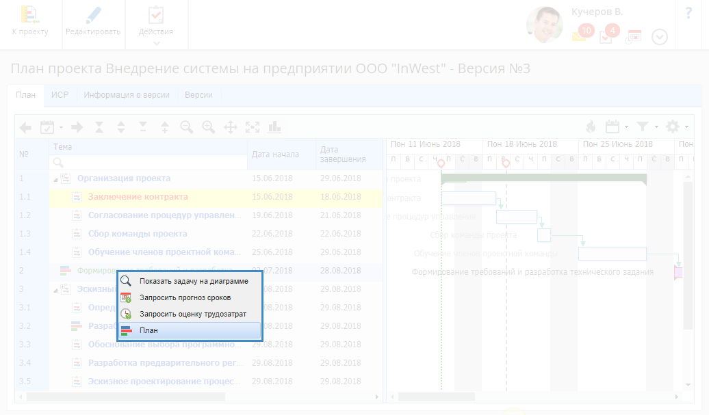 Рис. 2. Страница плана проекта. Контекстное меню задачи "Вложенный проект"