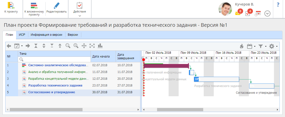 Вложенный проект считается выполненным тогда, когда выполнены все вложенные в него задачи. Процент выполнения вложенного проекта вычисляется автоматически из процента выполнения всех задач его календарного плана-графика и с учетом его длительности.