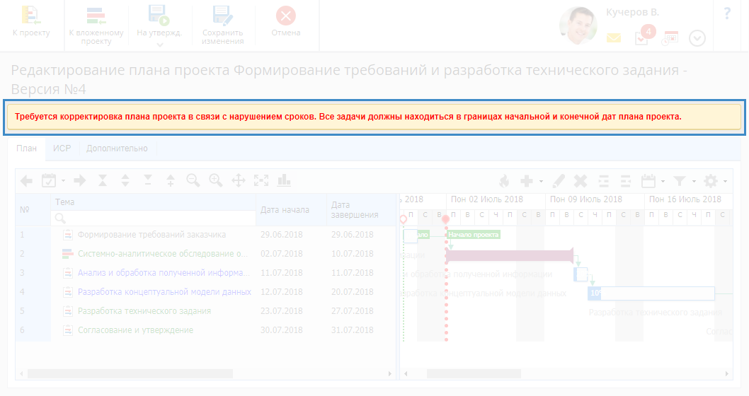 Если сроки задач вложенного проекта будут выходить за сроки, установленные в задаче вложенного проекта, будет отображено соответствующее уведомление (рис. 4).